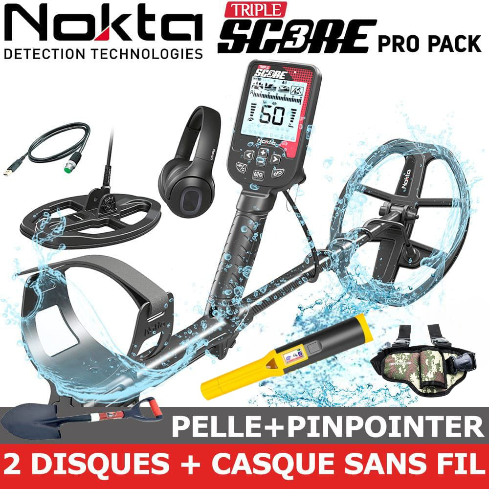 Pinpointer accupoint + pelle Spear & Jackson +holster inclus. Le NOKTA TRIPLE SCORE est un détecteur de métaux multifréquenceétanche à 5m doté de nombreux réglages avancés et capable de faire rayonner dans le sol plusieurs fréquences simultanément (MF). Cette technologie SMF permet de mieux identifier les cibles même dans un terrain très pollué, ainsi que détecter sur les zones les plus difficiles et minéralisées comme à la plage. (étanchéité à 5m, canne carbone télescopique, batterie rechargeable,m ises à jour gratuites...) auxquelles il ajoute 5 niveaux de puissance et des réglages comme effet de sol, réactivité, volume fer, notch... Autonomie 12h, poids 1.2kg, garantie 3 ans. 2 disques (30x23cm & 24x15cm)avec leur protège disque et casque sans fil inclus
