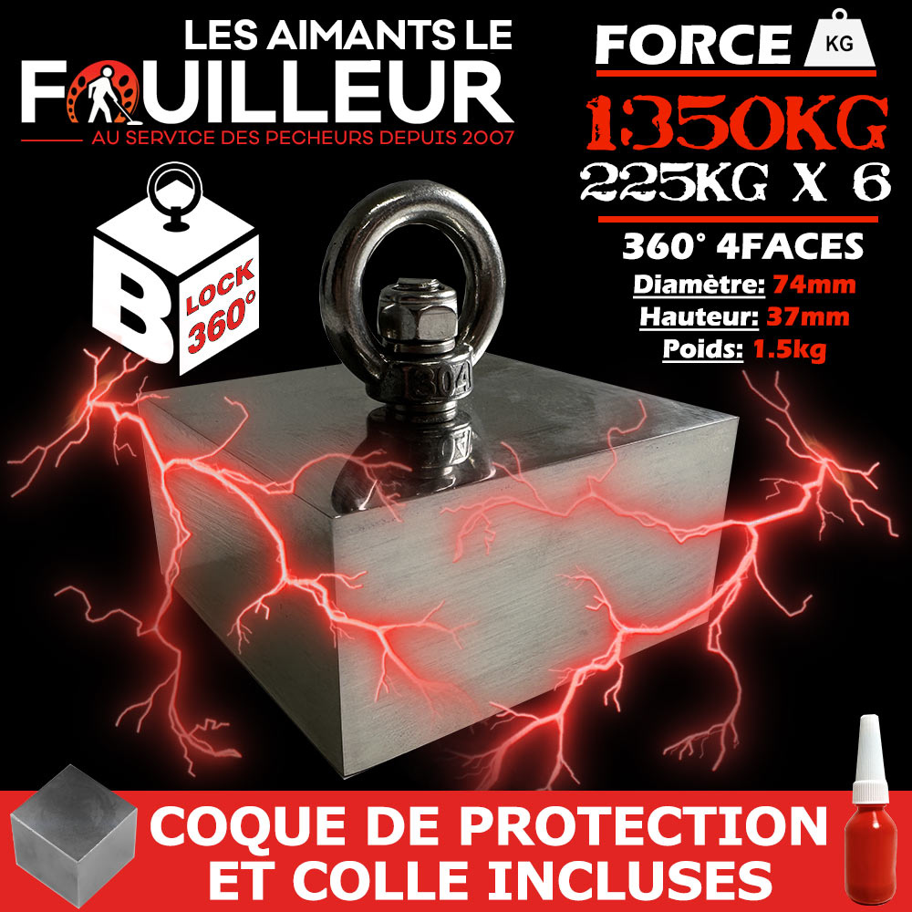 Le Fouilleur offre une gamme complète d’aimants Néodyme de grande qualité avec anneau de levage intégré en acier inoxydable. Les aimants Néodyme sont les aimants permanents les plus répandus et les plus puissants au monde. Nos aimants sont de type en pots car ils sont entourés d’un pot en acier. Ce dispositif a pour effet de concentrer le champ magnétique et d'augmenter la force d'adhérence de l’aimant vers le dessous du pot. Ils sont donc particulièrement adaptés à la recherche dans des puits ou dans les cours d’eau. Le néodyme réagit avec l'oxygène. Lorsqu'il n'est pas traité, il s'oxyde très rapidement. Pour cela, tous les aimants néodyme Le Fouilleur sont pourvus d'une couche protectrice. Celle-ci est si fine, que le type de revêtement n'influe pas sur la force d'adhérence de l'aimant. On utilise un triple traitement Nickel (Ni-Cu-Ni) de 12 micromètres pour le protéger. Contrairement à d’autres enseignes vantant des forces de levage/adhérence fantaisistes, nous garantissons les performances annoncées. Cependant, l’épaisseur de l’objet soulevé, la surface de contact, la teneur de fer de l’objet ainsi que son orientation peuvent grandement influer sur cette force théorique de levage. Ainsi, plus l’objet sera épais, plus il sera soulevé à la verticale, plus la surface de contact sera large, plus sa teneur en fer sera élevée et plus vos chance de remonter un objet dont le poids se rapproche du poids de levage maximum annoncé seront grandes.